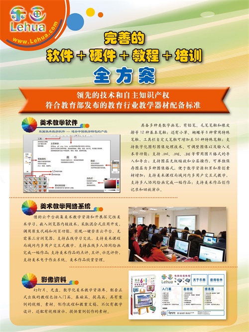 美術教學網絡系統、美術教學軟件、電子繪畫板、影像資料。3D打印機,3D樂畫筆。樂畫數字媒體創新實驗室以及樂畫藝術館整體方案