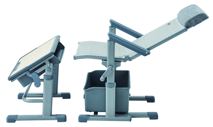 6、課桌椅午休模式:課桌通過兩側按鍵調節到最低高度,并將桌面向前下方折疊固定,課椅靠背向后調節,借助桌上和椅下空間,可在1米前后間距實現150度原位舒適躺休。