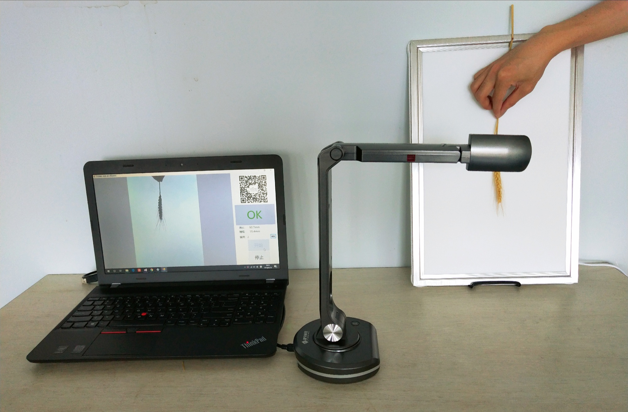 產品詳細介紹一、用途 作物的穗長、穗粗、莖粗、莖葉夾角,是作物表型的基本參數,其人工測量獲取工作繁重。本系統利用機器視覺智能識別技術來高效獲得精準的測量結果,為育種選材提供依據。 二、主要技術指標 1、用自動對焦的大景深800萬像素拍攝儀成像,由軟件自動識別計算。 2、★可自動測量水稻的穗長、莖粗、莖葉夾角參數,及小麥、谷子和高粱等的穗長、穗粗。 3、★穗子放穩后自動觸發識別,單穗自動測量≤2秒(最快可測30個穗長/分鐘)。也可外接條碼槍或鍵盤輸入樣品編號來觸發拍照測量。 4、穗長重復測量誤差≤±0.75mm、莖粗重復測量誤差≤±0.3mm、莖葉夾角重復測量誤差≤±1°。 5、設置參數帶有記憶,可重用�?勺詣尤コ竟让㈤L的干擾。 6、可設置測量界限值,語音自動報告篩選識別結果(穗長、莖粗、莖葉角過界報OK、不過則報NG)。 7、可存上萬張圖片及其對應的數據,并無線上網來遠程發送圖片、結果數據。 三、標準配置 1、SC-K水稻麥穗穗長-莖粗-莖葉角測量儀軟件U盤及軟件鎖1套 2、自動對焦的大景深800萬像素拍攝儀1臺 3、帶220V電源適配器的LED背光成像裝置 1個 4、尺寸標定板1塊 5、背光燈板支架1付 備注: 1、本技術標書中打★款項必須響應,否則為重大偏離。 2、本產品需使用電腦,推薦:品牌電腦(酷睿i5九代以上CPU/8G內存/無線網卡,4個以上USB2.0口,Windows 10完整專業版或旗艦版)。 |