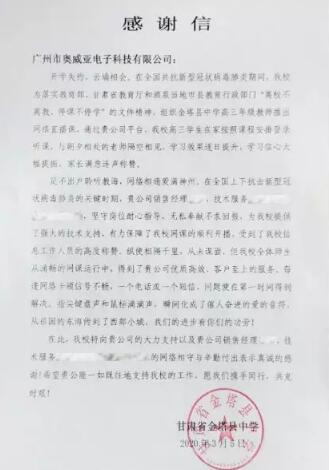 為最大程度減少因疫情延遲開(kāi)學(xué)帶來(lái)的影響,奧威亞充分發(fā)揮“云+端”技術(shù)優(yōu)勢(shì),為全國(guó)教育系統(tǒng)提供高效、高質(zhì)、有序的服務(wù),助力各地停課不停學(xué)。截至3月8日,奧威亞已免費(fèi)服務(wù)31個(gè)省份(含香港特區(qū))293個(gè)區(qū)縣,其中包括甘肅。憑借快速落地能力以及盡職盡責(zé)的服務(wù)精神,奧威亞獲得了甘肅各市縣教育局的高度肯定。