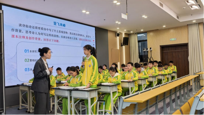 在課例展示環節,宋卓文老師將傳統文本細讀與現代技術手段有機融合,借助AI生成的沉浸式畫面,引導學生跨越時空限制,切身感受陳子昂與王安石筆下的登臨意境,生動呈現了科技與人文教學的有效結合。同時,AI循證教研系統自動記錄課程實施過程中的語音、板書、行為等數據進行識別、分析和統計,讓課堂教學細節“清晰可見”。