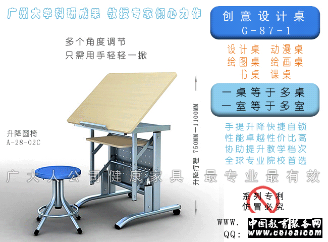 創意設計桌 多功能升降,一桌等于多桌: 普通書桌、繪畫,設計桌,一間課室等于多間課室。 ·作普通書桌:可微調高度角度,預防近視、腰椎病和頸椎病。 ·特殊書桌:可站立學習和工作,回復人體脊椎和呼吸的自然狀態,預防肥胖和痔瘡。 ·作繪畫桌、設計桌:可調任意角度,可調節多個高度,可疊加大圖板;無需電源,價格低廉。 CREATIVITY TABLE Multifunctional movement,One desk has more functions: common desk, rawing table,designingtable. One classroom had three functions. ·As general desk :The height and the angle can be adjust,prevent from short sight , lumbar and neck hurt . ·As special desk :Can study and work at stand pose, and make your chine release, prevent illness . ·As design table :The angle and the height can be adjust ,and attach a big size board. No power needed ,low price.