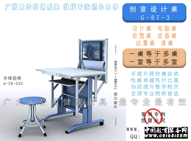 創意設計桌 多功能升降,一桌等于多桌: 普通書桌、繪畫,設計桌,一間課室等于多間課室。 ·作普通書桌:可微調高度角度,預防近視、腰椎病和頸椎病。 ·特殊書桌:可站立學習和工作,回復人體脊椎和呼吸的自然狀態,預防肥胖和痔瘡。 ·作繪畫桌、設計桌:可調任意角度,可調節多個高度,可疊加大圖板;無需電源,價格低廉。 CREATIVITY TABLE Multifunctional movement,One desk has more functions: common desk, rawing table,designingtable. One classroom had three functions. ·As general desk :The height and the angle can be adjust,prevent from short sight , lumbar and neck hurt . ·As special desk :Can study and work at stand pose, and make your chine release, prevent illness . ·As design table :The angle and the height can be adjust ,and attach a big size board. No power needed ,low price.