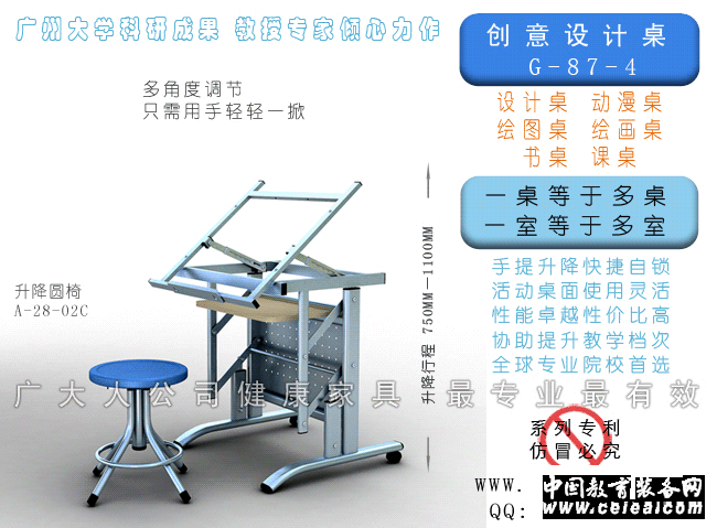 classroom had three functions. ·As general desk :The height and the angle can be adjust,prevent from short sight , lumbar and neck hurt . ·As special desk :Can study and work at stand pose, and make your chine release, prevent illness . ·As design table :The angle and the height can be adjust ,and attach a big size board. No power needed ,low price.