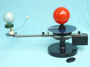 4、日食和月食:  演示時,使月球處于地球和太陽之間,再調整月球軌道圈,使月、地、日三者成一直線,月球的影子投射在球上,便發生日食。如地球處于月球與太陽中間,月球進入地形,便產生月食。
