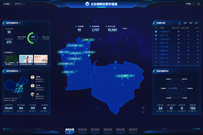 希沃區校一體化魔方平臺的引入,為太白湖新區的教育帶來了多方面的積極變化。太白湖新區按照 “1256” 創建思路,圍繞一個 “數字太白湖” 教育治理基座、兩項智慧生態校園環境提升建設、五類智慧教育數據要素采集匯聚、六項智慧教育創新應用開展建設。以數據驅動教育資源均衡配置、精準教學、教育評價改革以及教育科學治理和服務,以智能終端、數字應用、數據融合、資源共享為切入點,探索以教學為核心的應用創新實踐。