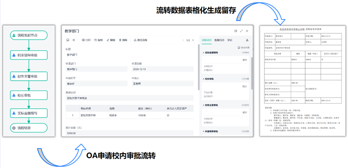 智能流轉展示,數據賦能管理升級:智能化的表格生成技術如同一位智能助手,讓電子化數據能夠智能展示,并生成為紙質內容進行留存,為學校辦公管理帶來極大便利。過往流程數據看板缺少自主調配性,電子流程和紙質留存二者很難兼顧,現在學校也可以自行搭建數據看板,按需進行數據展示,電子流程生成為紙質表格也輕松簡單,智能生成技術提高了數據處理的效率和準確性,為學校的辦公管理節省了大量人力物力,讓校園辦公更智能高效。