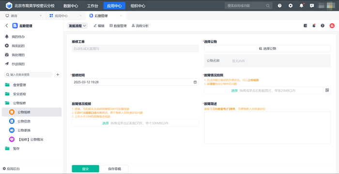OA 流程自主調配,效率飛躍新境界:輕量化OA流程猶如一把靈活的工具,讓辦公變得輕松高效。學校根據實際辦公流程輕松搭建流程,就像搭建積木一樣進行自由組合。以設備報修流程為例,以前繁瑣的報修流程,如今只需在OA系統中填寫信息,拍攝問題照片添加描述,申請便會流轉到相關維修人員處進行設備問題預警,維修完成后,領導可收到通知進行結果核實,讓整體流程變得高效便捷。
