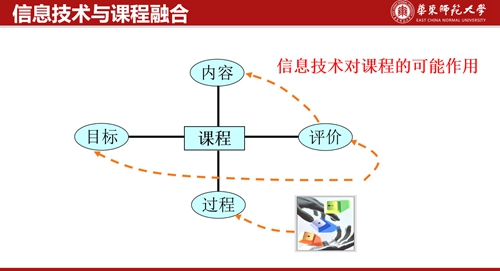 概括的來說可以用這個(gè)圖,該能力由課程所涉內(nèi)容,培養(yǎng)教學(xué)的目標(biāo)、教學(xué)的過程以及教學(xué)的評(píng)價(jià)組成。在信息技術(shù)整合與學(xué)科教學(xué)推進(jìn)的過程當(dāng)中,我們還必須要利用信息技術(shù)支持內(nèi)容的準(zhǔn)備,去支持在我們現(xiàn)在的環(huán)境當(dāng)中去開展教學(xué)的過程,以及對(duì)學(xué)生的進(jìn)行過程性以及結(jié)構(gòu)性的評(píng)價(jià)。