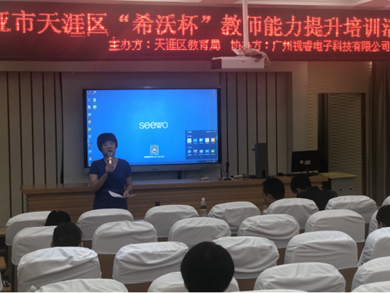 其次是線下的初級培訓。初級培訓階段,希沃團隊的金牌講師下到天涯區(qū)的每一學校,進行到校的培訓,為老師們講解希沃交互智能平板的使用技巧并解答相關問題。培訓落地到每一個學校,無論距離多遠,希沃講師也會到現(xiàn)場進行培訓。