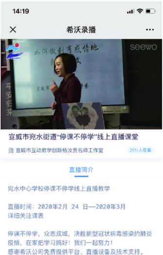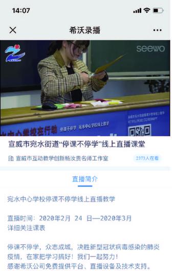 學(xué)校于2020年2月24日起,周一至周五每天對(duì)全體學(xué)生開(kāi)展宛水中心學(xué)校線(xiàn)上教學(xué)直播課程,課程內(nèi)容豐富有趣,分別有:疫情防控知識(shí)宣傳;疫情下對(duì)學(xué)生的愛(ài)國(guó)主義宣講;經(jīng)典、古詩(shī)文教學(xué)欣賞;“閱讀悅美”讀書(shū)活動(dòng);數(shù)學(xué)趣味教學(xué);唱歌、舞蹈教學(xué)欣賞;“小巧手、大智慧”手工教學(xué);“寫(xiě)好中國(guó)字、做好中國(guó)人”書(shū)法教學(xué);英語(yǔ)趣味活動(dòng);每天小健身活動(dòng);家庭教育小故事分享等課程內(nèi)容。學(xué)生通過(guò)登錄希沃錄播網(wǎng)址、分享鏈接或掃描二維碼便可在手機(jī)、電腦、平板等端口進(jìn)行觀(guān)看學(xué)習(xí)。
