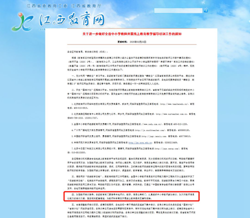2月25日,江西省教育廳發布了《關于進一步做好全省中小學教師開展線上教育教學輔導培訓工作的通知》。通知中特別指出了:“加強教師培訓指導:各級教育部門要指導本地師訓、教研、信息化等部門,認真組織中小學教師參加培訓,加大對教師信息化能力的培訓力度,落實相關配套措施,為教師科學高效開展線上教學提供支撐和保障。”