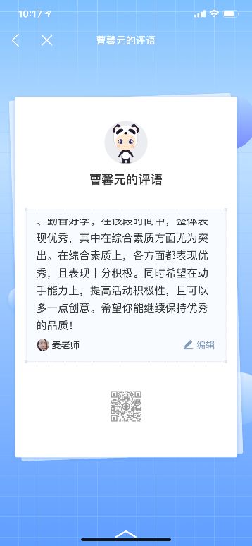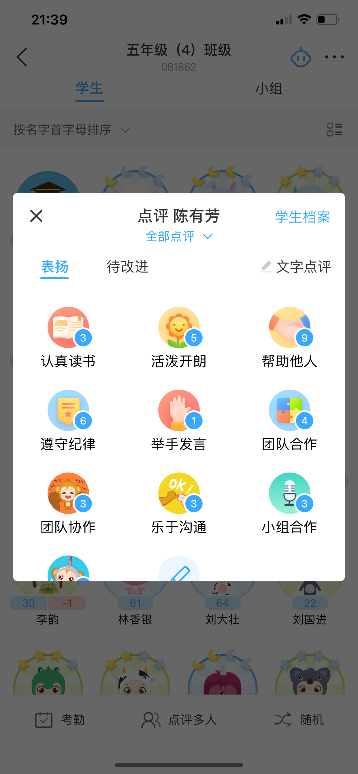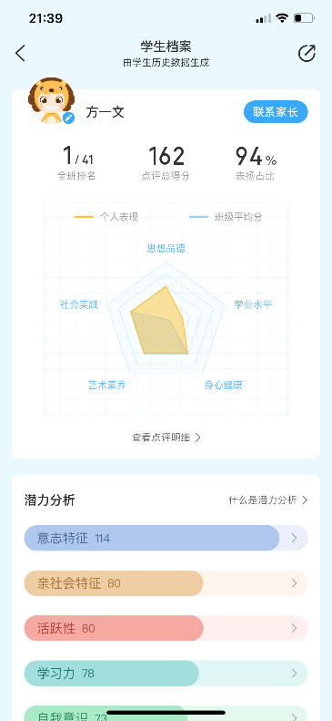 班優(yōu)中豐富的點(diǎn)評(píng)功能讓老師實(shí)時(shí)記錄孩子們的每一個(gè)閃光點(diǎn),每周更新的光榮榜更能激發(fā)孩子們的學(xué)習(xí)熱情。基于過程性評(píng)價(jià),班優(yōu)還提供了階段性的智能評(píng)語,老師只需一步操作就能為每一個(gè)孩子生成個(gè)性化的成長建議。