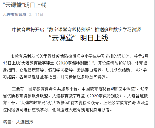 自疫情爆發(fā)以來,大連市教育局組織全市數(shù)百位教學名師精心制作,結(jié)合學生假期學習生活特點,推出了“大連教育數(shù)字課堂(2020寒假特別版)”,開設(shè)疫情防護知識、假期學習指導(dǎo)、名師課程講堂等欄目,并同步推送多種數(shù)字資源。
