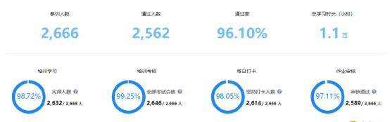 此次培訓(xùn)獲得河池宜州區(qū)教育局高度重視以及全區(qū)老師的積極響應(yīng),截至2020年6月1日,初階培訓(xùn)取得圓滿的成功,全區(qū)教師累計(jì)學(xué)習(xí)時(shí)長(zhǎng)共計(jì)1.1萬(wàn)小時(shí),培訓(xùn)考核通過人數(shù)為2562人,考核成功率超96%,此次培訓(xùn)達(dá)到預(yù)定目標(biāo),基本實(shí)現(xiàn)老師能夠通過培訓(xùn)掌握交互式課件制作的要求。