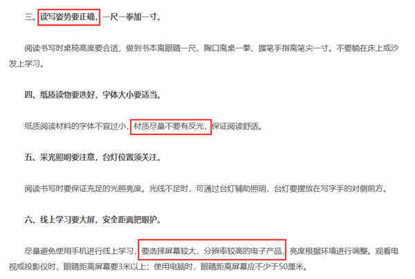 眾所周知,中小學階段正處于視力發育的關鍵時期,呵護用眼健康,不僅要保持正確的讀寫姿勢,還要主動選擇有益于眼健康的環境。對此,《要訣》中明確提出了“讀寫姿勢正確”、“閱讀材質不反光”、“選擇屏幕較大、分辨率較高的電子產品”等需求。
