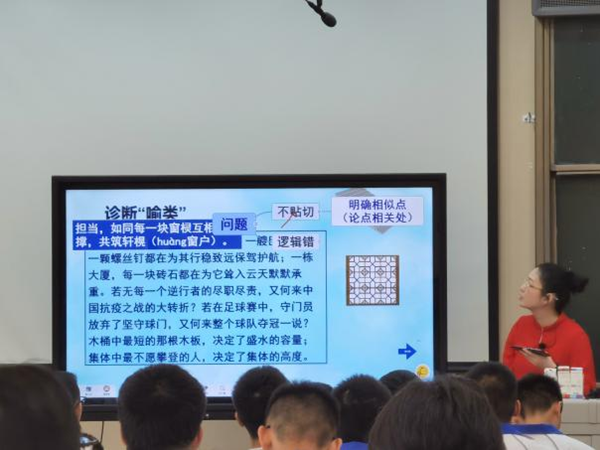 在課中,肖老師通過(guò)展示學(xué)生作品中的論證問(wèn)題,結(jié)合“新木桶原理四法則”對(duì)定義進(jìn)行了生動(dòng)的講解和剖析,讓學(xué)生們形象地理解喻證法。