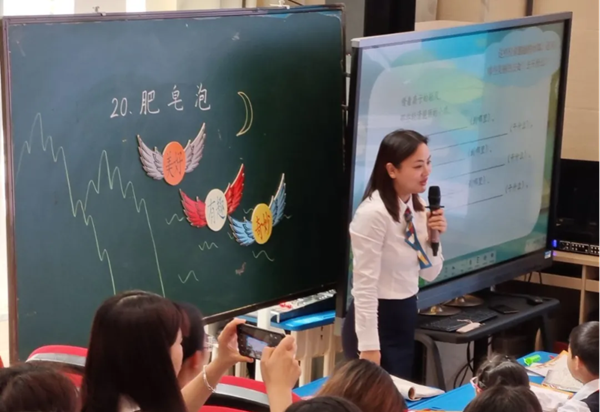 現(xiàn)場(chǎng)所有參賽老師都使用了希沃的信息化教學(xué)軟件——希沃白板及班級(jí)優(yōu)化大師輔助課堂教學(xué)。瀘州市梓橦路小學(xué)校桂秋瓊老師喜獲特等獎(jiǎng),桂老師執(zhí)教的是部編版小學(xué)語(yǔ)文三年級(jí)下冊(cè)的《肥皂泡》一課,通過(guò)抓關(guān)鍵詞理解難懂的句子。本堂課信息化教學(xué)應(yīng)用巧妙,借助希沃中的課堂活動(dòng)激發(fā)學(xué)生學(xué)習(xí)的興趣,自制教學(xué)視頻實(shí)現(xiàn)課堂與生活的有效連接,同步課堂實(shí)現(xiàn)了兩校師生同時(shí)在線學(xué)習(xí)。全市小學(xué)教師代表大約共計(jì)600人次聽課觀摩。