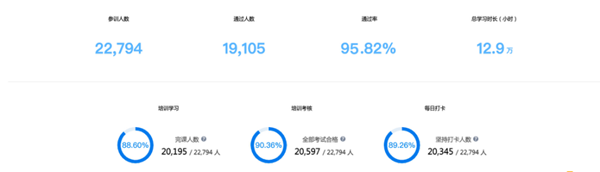 在骨干教師返校培訓(xùn)之后,全市還開展了為期16天的線上訓(xùn)練營(yíng),加強(qiáng)鞏固老師的教學(xué)應(yīng)用技能。據(jù)悉,此次培訓(xùn)采用線上培訓(xùn)+線下實(shí)操的形式進(jìn)行,此次培訓(xùn)在線時(shí)間最長(zhǎng)達(dá)17.2w小時(shí),參與人數(shù)高達(dá)22794人,培訓(xùn)通過(guò)率為95.82%。