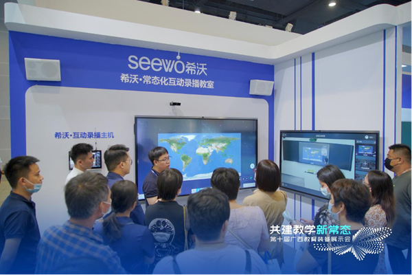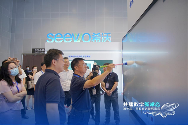 展會現(xiàn)場,廣西省南寧市人民政府副秘書長蒙文虎等領(lǐng)導(dǎo)蒞臨希沃展位,深度體驗了全形態(tài)墻面一體化產(chǎn)品解決方案、交互智能平板高精度紅外系列、精品錄播教室和一體化LED顯示終端等產(chǎn)品方案。其中,希沃四邊紅外智慧黑板所搭載的一鍵開啟主屏和副屏記憶存儲功能,和在傳統(tǒng)板書習(xí)慣與全新智能交互結(jié)合上的完美體驗,受到現(xiàn)場領(lǐng)導(dǎo)的一致認可。