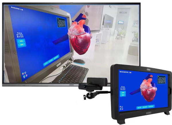 目前,基于該架構(gòu),希沃提供3D/VR教學(xué)方案和AR教學(xué)方案。3D/VR教學(xué)方案還原各類實(shí)訓(xùn)場景,具有虛實(shí)結(jié)合、體驗(yàn)逼真、交互多樣的特點(diǎn),教師操作桌面VR交互一體機(jī),學(xué)生佩戴3D眼鏡在座位上觀看黑板,即可看到更逼真的教學(xué)畫面。