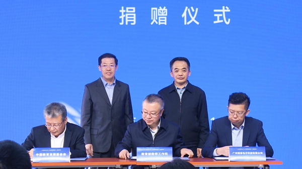 (教育部教師工作司司長任友群、視睿科技副總裁崔劍、中國教育發(fā)展基金會秘書長王建光進(jìn)行三方代表簽約)