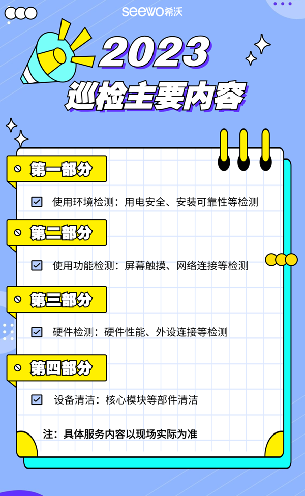 除了升級服務之外,本次巡檢活動將繼續(xù)從設(shè)備保養(yǎng)、硬件服務、軟件服務、網(wǎng)點服務、增值服務五個維度對希沃設(shè)備進行檢測和保養(yǎng),以標準化的巡檢保養(yǎng)處理流程,提供環(huán)境、功能、硬件和清潔等共17項檢測,為師生教學體驗保駕護航。