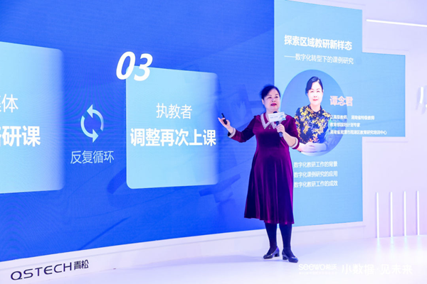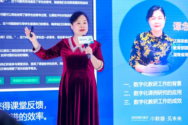展會(huì)上,一場(chǎng)交流會(huì)吸引了現(xiàn)場(chǎng)眾多觀眾的駐足圍觀,教育部國(guó)培計(jì)劃專(zhuān)家、湖南省湘潭市雨湖區(qū)教育研究培訓(xùn)中心數(shù)學(xué)教研員譚念君,以“探索區(qū)域教研新樣態(tài)——數(shù)字化轉(zhuǎn)型下的課例研究”為題,向觀眾分享了數(shù)字化教研經(jīng)驗(yàn),共同研討數(shù)字化教育的新發(fā)展。
