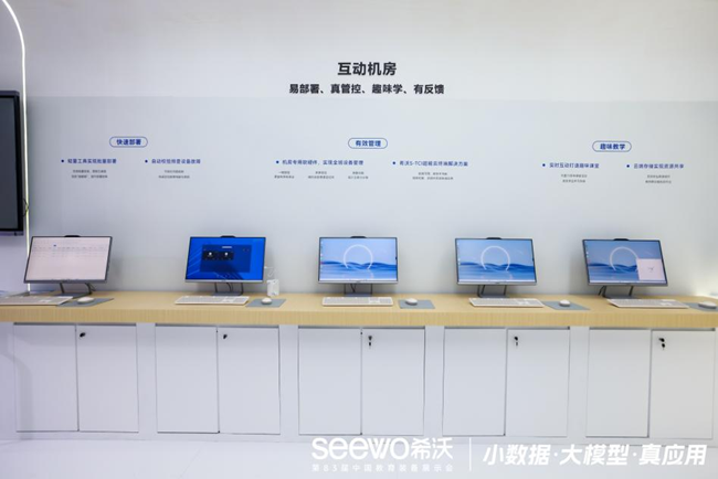 統(tǒng)機房教學場景中需部署設(shè)備多、維護成本大、教師管理難度高等難題,希沃在本屆展會上帶來了全新的校園機房解決方案,并展出專為教師辦公設(shè)計的希沃一體式教學終端A24,提高教師備授課和辦公效率。