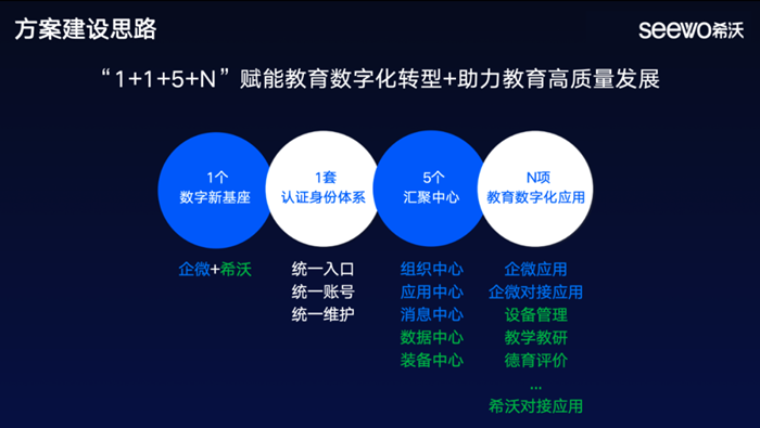 此次合作,希沃魔方與企業(yè)微信基于希沃魔方·數(shù)字基座的全景架構(gòu),結(jié)合希沃在硬件終端、教育應(yīng)用及數(shù)據(jù)平臺(tái)的建設(shè)基礎(chǔ),以及希沃魔方和企業(yè)微信優(yōu)秀的第三方開放能力,總結(jié)出“1+1+5+N”的數(shù)字基座構(gòu)建思路。即對(duì)端口、身份及組織架構(gòu)進(jìn)行統(tǒng)一,構(gòu)建完整的應(yīng)用中心整合體系,為用戶提供教育全場景應(yīng)用,實(shí)現(xiàn)了數(shù)字基座的整體構(gòu)建,助力推動(dòng)數(shù)字技術(shù)全面賦能教育生態(tài)系統(tǒng)的進(jìn)程。