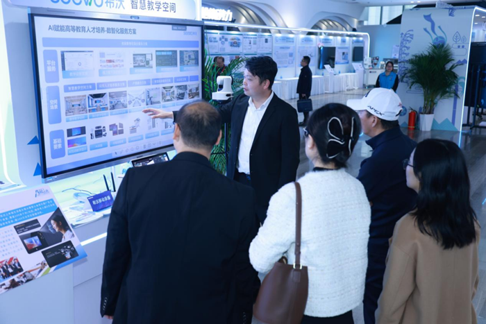 現場,希沃高教AI解決方案亮相,包含希沃本科教學質量評估系統、希沃教學督導平臺、希沃機器人實驗平臺模擬技術實踐應用等解決方案內容,吸引眾多嘉賓駐足。