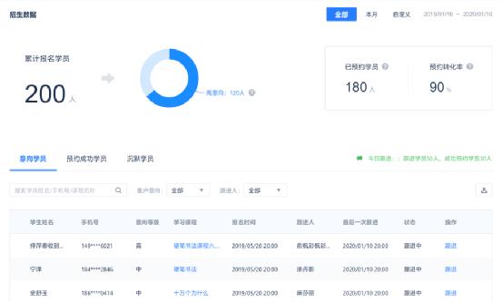 對于管理者來說,流量需要轉化。招生管理系統專為管理者篩選高潛用戶,提煉優質商機。系統無需用戶提交報名,查看課程即可獲取商機,記錄課程行為軌跡,對客戶進行分類,管理者提供精細化運營。