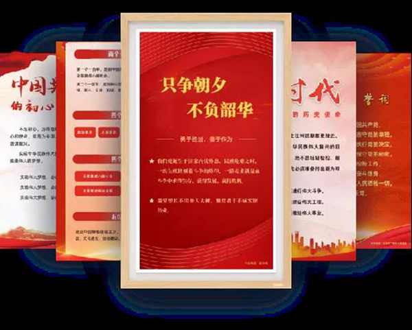 黨建宣傳方案通過智慧黨建文化墻的形式,不僅讓宣傳工作變得更加生動有趣,更富吸引力,也幫助宣傳人員提升了宣傳工作效率。黨建云屏后臺收錄了豐富的宣傳資源,并不定期更新,包括建黨節、建軍節、國慶節、改革開放日、革命紀念日等重大節日海報內容,宣傳人員可以根據具體需求進行線上一鍵發布,節省了素材收集和制作的時間,也避免了因使用易老化紙質海報而造成的資源浪費。同時,方案內的黨員風采展示屏,還能被用于展播支部黨員正能量事跡,發揮“榜樣在身邊”的感召力量。在展現形式上,宣傳者可以隨心采用分屏或單屏模式進行圖片或視頻的呈現,告別審美疲勞。