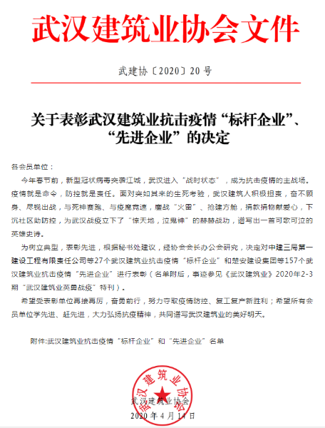 近日,武建協(xié)【2020】20號(hào)文件發(fā)布了《關(guān)于表彰武漢建筑業(yè)抗擊疫情“標(biāo)桿企業(yè)”“先進(jìn)企業(yè)”的決定》,