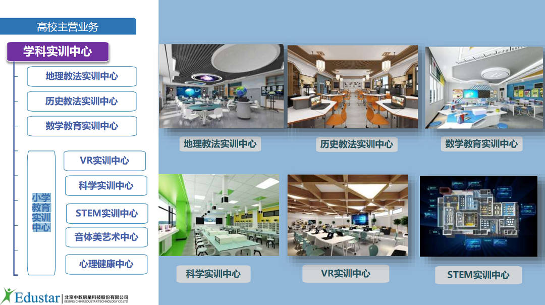 現代教育裝備:數字星球系統,中學數字化地理專用教室、中學歷史專用教室、虛擬現實實驗室、數學探究實驗室,小學科學教室、新建校整體解決方案、教育創客空間;教育信息化:教育公用服務平臺、人人通解決方案、生態化教學研環境構建方案、區域教育資源中心解決方案、微課平臺校外科技教育:綜合實踐基地整體解決方案、青少年活動中心解決方案、科技館建設整體解決方案