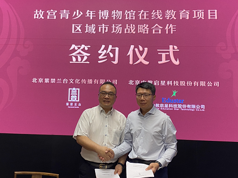 2023年6月6日,北京中教啟星科技股份有限公司與北京紫禁蘭臺文化傳播有限公司舉行了故宮青少年博物館在線教育項(xiàng)目區(qū)域市場戰(zhàn)略合作簽約儀式,并達(dá)成了戰(zhàn)略合作伙伴關(guān)系。