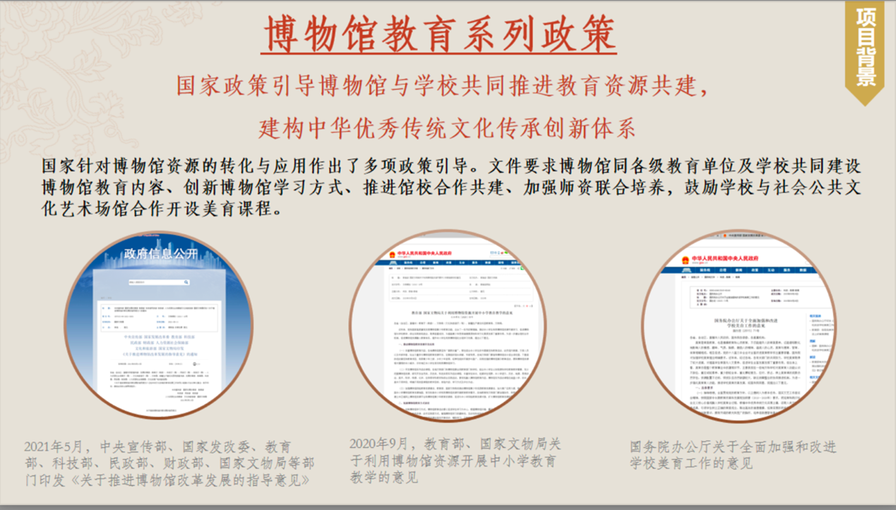 緊接著在文化強(qiáng)國、文化自信和講好中國故事的時(shí)代背景下,結(jié)合習(xí)近平總書記“一個(gè)博物院就是一所大學(xué)”的講話精神,以及近年教育“雙減政策”下,中小學(xué)對(duì)傳統(tǒng)文化綜合素質(zhì)實(shí)踐課、勞動(dòng)課、美育課以及課后三點(diǎn)半教學(xué)等校內(nèi)教育需求,故宮博物院故宮學(xué)校為進(jìn)一步落實(shí)“引導(dǎo)博物館與學(xué)校共同推進(jìn)教育資源共建,建構(gòu)中華優(yōu)秀傳統(tǒng)文化傳承創(chuàng)新體系”的國家政策,特開展了青少年博物館在線教育項(xiàng)目,結(jié)合每件藏品的深刻內(nèi)涵設(shè)計(jì)成課程,傳播真實(shí)、可信、富有情感和生命力的知識(shí)內(nèi)容。