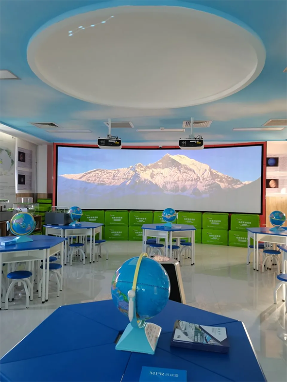 環(huán)幕示教系統(tǒng)位于教室后方,專用于地理視頻資源的播放。巨大的屏幕帶來震撼的視覺沖擊,直觀地展示事物發(fā)展的動態(tài)過程,讓課程內(nèi)容變得更生動有趣。視頻課件對課程的導入、過渡作用,使課程進行得更自然順暢。