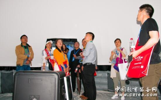 羿飛教育本次帶來的是一個小型球幕影院,直徑六米,影像面積約50平米左右,與16:9的420寸屏幕影像面積相當,置身其中幾乎是融入到影像中的感覺,配合環繞聲音響,即可以“穿梭于”浩瀚無際的宇宙,可以認知宇宙的秘密和歷史;也可以變為細胞,深入生命體的微觀世界;還可以乘坐時間機器般回到遙遠的過去與恐龍同行、可以來到遙遠的未來去感受全新的科技化生活。