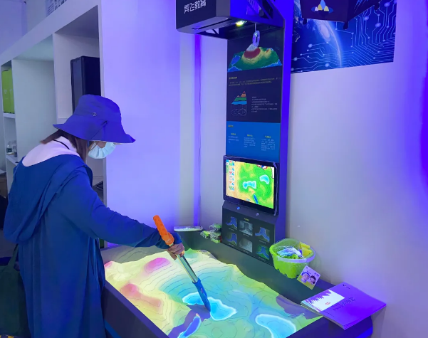 ▲AR地理沙盤:投影的成像隨著沙堆高度的改變而呈現不同的地形地貌,還可模擬降雨、火山爆發等地理活動。