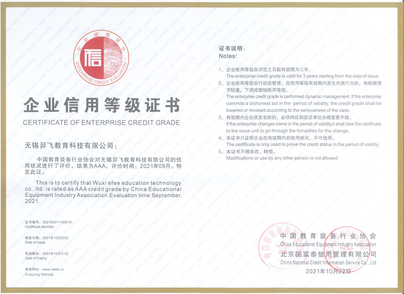 無錫羿飛教育科技有限公司自成立以來陸續取得多項榮譽資質:江蘇省民營科技企業、科技創新先進企業、江蘇省科普產業研發基地等。并已擁有近百項專利技術、注冊商標和軟件著作權。作為國內先進教育裝備提供商,一直以來都是中國教育裝備行業協會的優秀會員。羿飛教育不斷開拓創新,以技術為先導,以產品為平臺,以應用為核心,以服務為保障,企業AAA信用等級是對羿飛教育的認可與肯定。