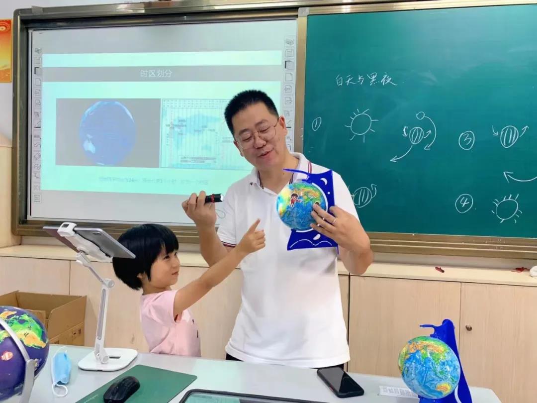 學府路實驗小學開展了地理特色課程,劉老師循循善誘,帶領學生探索白天和黑夜的產生、地球的運動變化。學生們爭先恐后的用晝夜地球儀做實驗,在實驗過程中慢慢領悟時區與時差的概念。
