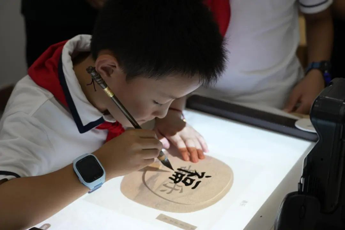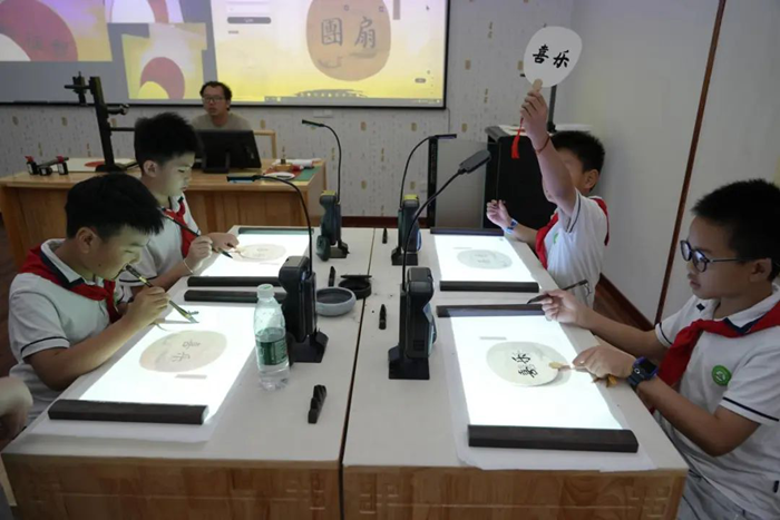 而數字化書法教室則彌漫著濃厚的傳統文化氣息。數字書法臨摹臺上,學生們可以選擇不同的碑帖進行臨摹,通過數字臨摹學些臺的輔助,能夠清晰地看到筆畫的走勢。科技為傳統書法藝術的學習帶來了新的便捷與樂趣,隊員們沉浸其中,感受著書法藝術的博大精深。