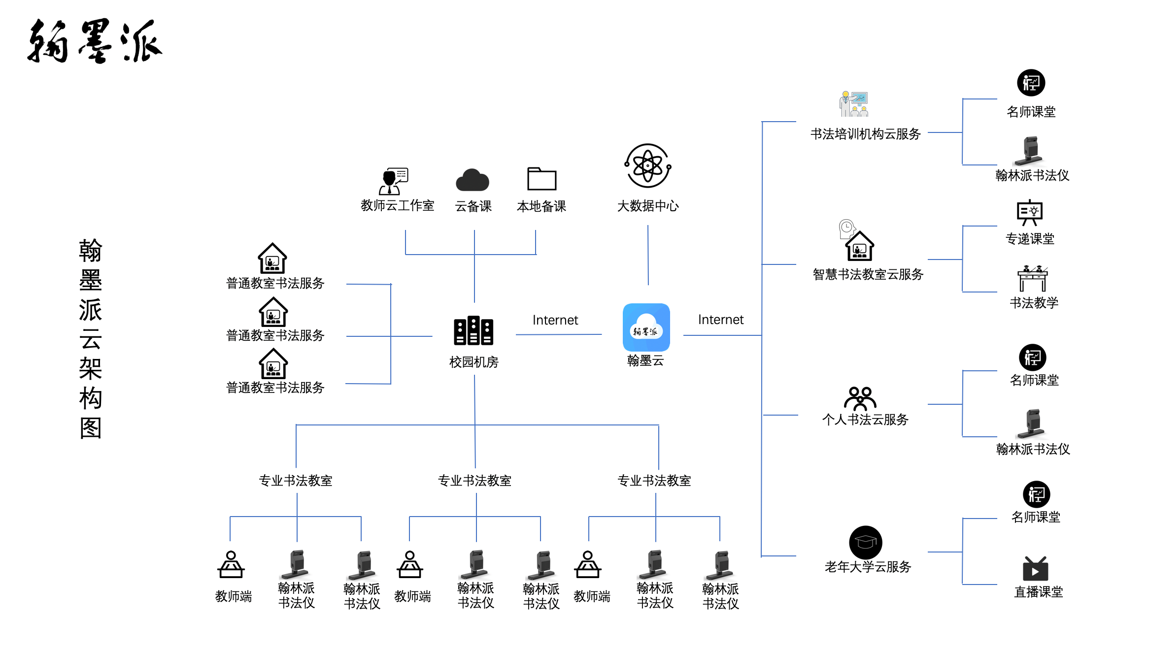 翰墨派基于云技術的書法教學系統,支持全校師生在線上課,學生的上課場景可以是在書法實驗室,普通教室,學生宿舍或者家里。每個學生都可以注冊自己的學習賬號,賬號支持在教室登錄,也支持在手機等其他移動設備上登錄,使用云書法教學軟件進行書法學習,習帖、臨摹、創作、完成作業并與教師互動交流。