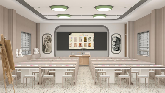 翰墨派數字美術教室圍繞課堂教學出發,符合義務教育2022課程標準的要求進行美術課程設置,將智慧課堂教學手段運用于美術教學場景。除支持覆蓋數字繪畫教學場景外,還支持素描、速寫、水粉、水彩、工筆畫和國畫等傳統紙筆繪畫教學場景。再借助智慧美術教學終端設備,為學生提供沉浸式、自助式和交互式的美術鑒賞課。另外通過智能化和網絡化技術手段,實現趣味性分組互動教學場景,可應用到貼紙、剪紙和泥塑等美術手工教學場景中。