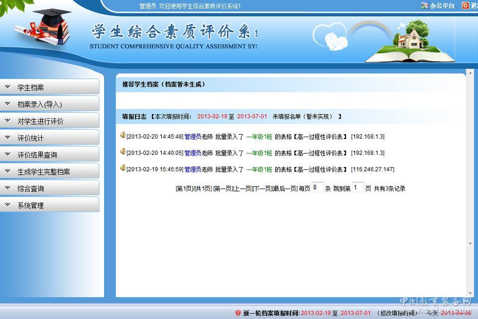 開(kāi)啟評(píng)價(jià)配置評(píng)價(jià)基礎(chǔ)信息,錄入所有學(xué)生的檔案信息,維護(hù)檔案信息,管理開(kāi)關(guān),查看所有報(bào)表信息。導(dǎo)出各種檔案報(bào)表。
