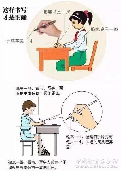 保持正確的讀寫坐姿。牢記“一拳一尺一寸”。眼睛距離書本應(yīng)為一尺(33-35厘米)、胸前與課桌距離應(yīng)為一拳(8-10厘米)、握筆時筆桿與紙面的角度在40-50度之間,手指與筆尖距離應(yīng)約為一寸(約3厘米);