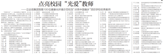 100位健康光環境示范校及“點亮中國偏鄉”項目學校優秀教師代表如下:
