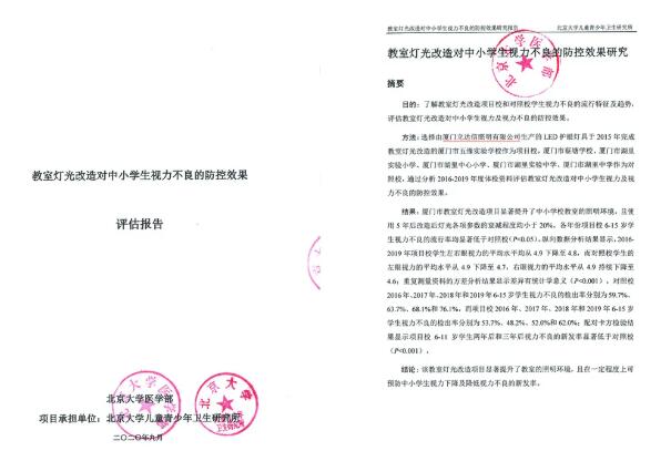 北京大學(xué)醫(yī)學(xué)部、北京大學(xué)兒童青少年衛(wèi)生研究所(國(guó)標(biāo)GB7793-2010《中小學(xué)校教室采光和照明衛(wèi)生標(biāo)準(zhǔn)》、國(guó)標(biāo)GB40070-2021《兒童青少年學(xué)習(xí)用品近視防控衛(wèi)生要求》主起草單位)出具的權(quán)威評(píng)估報(bào)告顯示:立達(dá)信健康光環(huán)境改造項(xiàng)目顯著提升了教室的照明環(huán)境,在一定程度上可預(yù)防中小學(xué)生視力下降和降低不良視力的新發(fā)率。