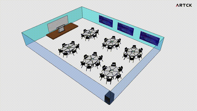 目前高校的智慧型教室,很多都是采用研討型小組式設計,老師和每個小組都需要獨立擴聲。這種場景,以往的吊麥擴聲,沒法實現精準分區拾音,且全范圍拾音擴聲效果較差,滿足不了智慧教室的高品質要求;假如采用有線話筒方案來解決,使用者的活動范圍嚴重受限,長距離布音頻線風險高,線材要求高、通用性差,設備要求也較復雜;又或者采用一般的無線話筒,無論是一師一麥的教學話筒,還是傳統的專業無線話筒,不但存在上面分析的接收機和天線部署的矛盾,多話筒共用時天線密集安裝還會產生信號干擾,嚴重影響信號的穩定性和使用體驗,安裝施工也十分復雜困難。